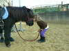 "Le lundi matin, nous allons avec Alain à l’équicie. Nous sortons les poneys de leur enclos avec l’aide de Lise et d’une stagiaire, Anne. Nous brossons les poneys avec nos doigts ou une brosse. Une fois qu’ils sont bien brossés, nous faisons un parcours entre les barres couchées afin de délasser le poney. J’ai fait un parcours libre, sans barres. Comme récompense, il a eu une carotte. Nous sommes heureux de cette activité. "